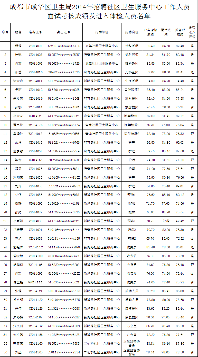 成都市成華區(qū)衛(wèi)生局2014年招聘社區(qū)衛(wèi)生服務(wù)中心工作人員面試考核成績及進(jìn)入體檢人員名單